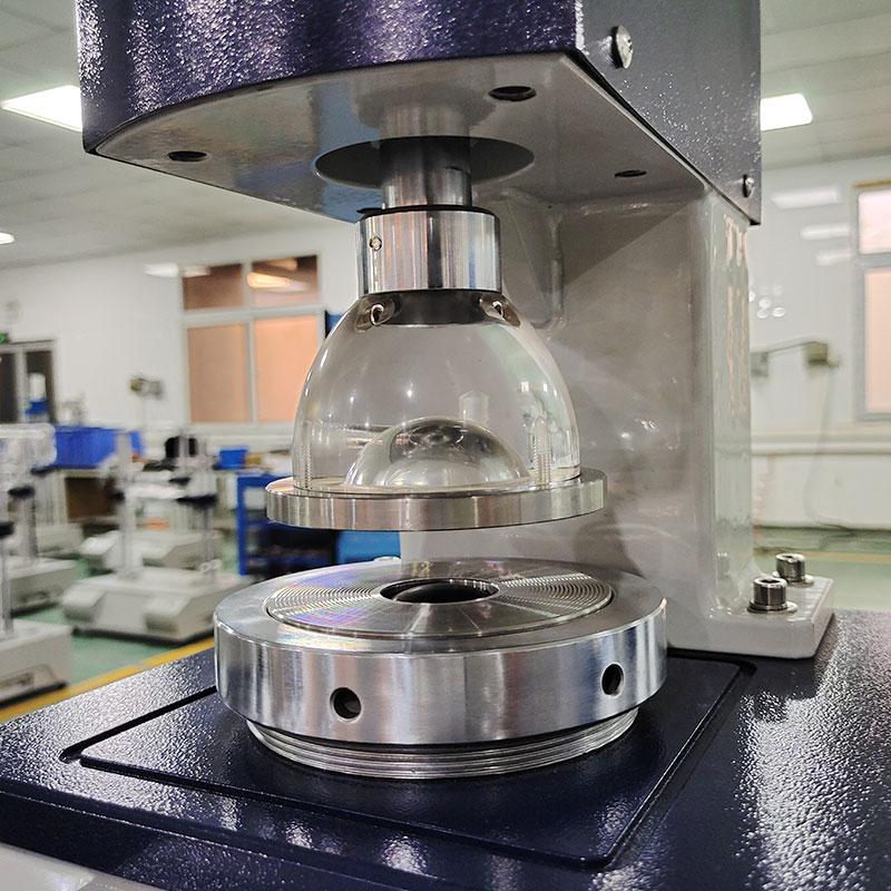 在儀器密封的油缸和壓紙座的容腔內(nèi),裝滿甲基硅油作為壓力傳遞的介質(zhì),當(dāng)電機(jī)帶動(dòng)活塞勻速前進(jìn)時(shí),橡皮膜受到硅油的加壓而突起,此時(shí)夾持在膠膜上方,被上下夾盤固定住的試樣,均勻受力,直到試樣破裂,處理芯片鎖住最大壓力值,通過(guò)液晶屏顯示該壓力值,此壓力值即為本次試樣的耐破度。